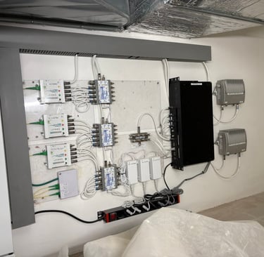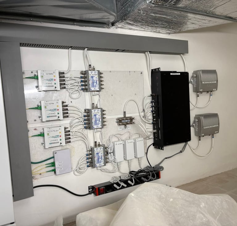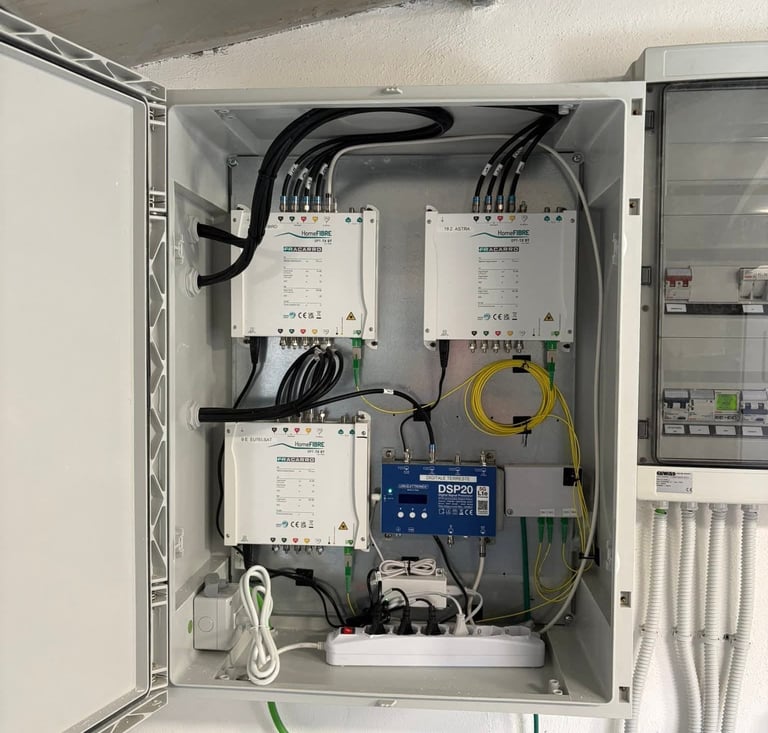 La soluzione New Digital Box: Per una struttura ricettiva della zona, abbiamo progettato e installato una centrale di distribuzione a fibra ottica. Questo sistema permette di trasportare il segnale satellitare e terrestre in decine di stanze senza alcuna perdita di qualità.